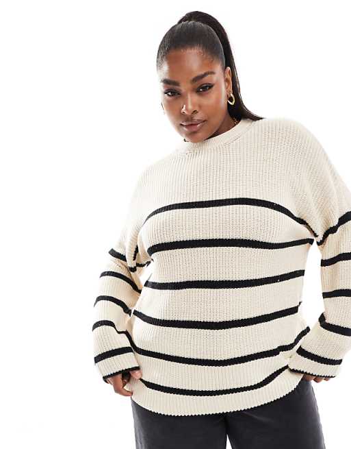 ONLY Curve – Gestreifter Pullover in Steinbeige mit Rundhalsausschnitt
