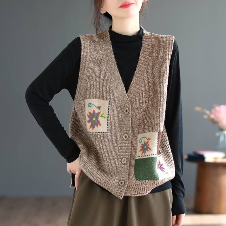 Pullunder Für Damen,Damen Weste Mit V Ausschnitt, Gestrickte Weste, Khaki, Kariert, Floraler Jacquard, Knopf, Cardigan, Unregelmäßiger Saum, …